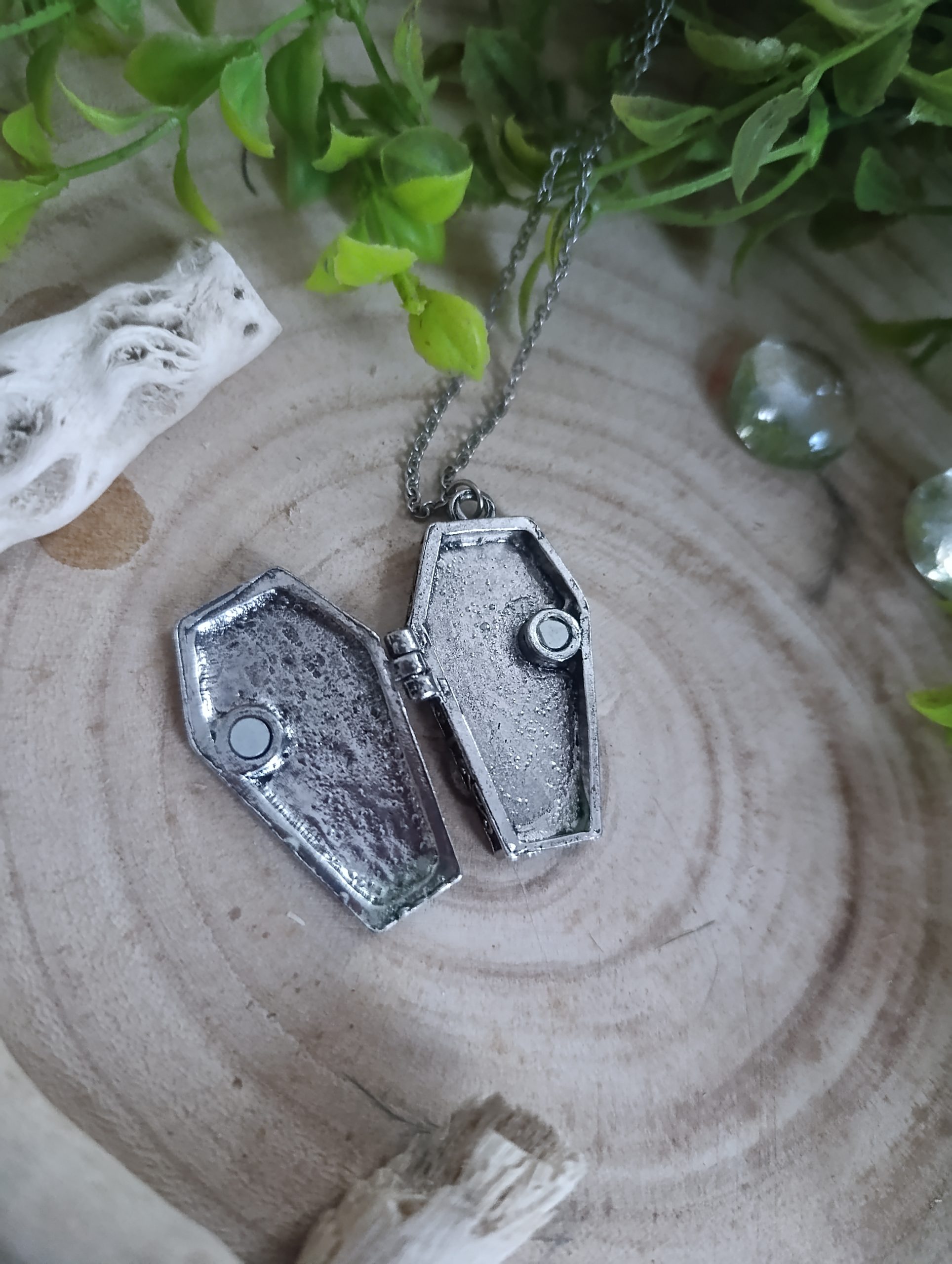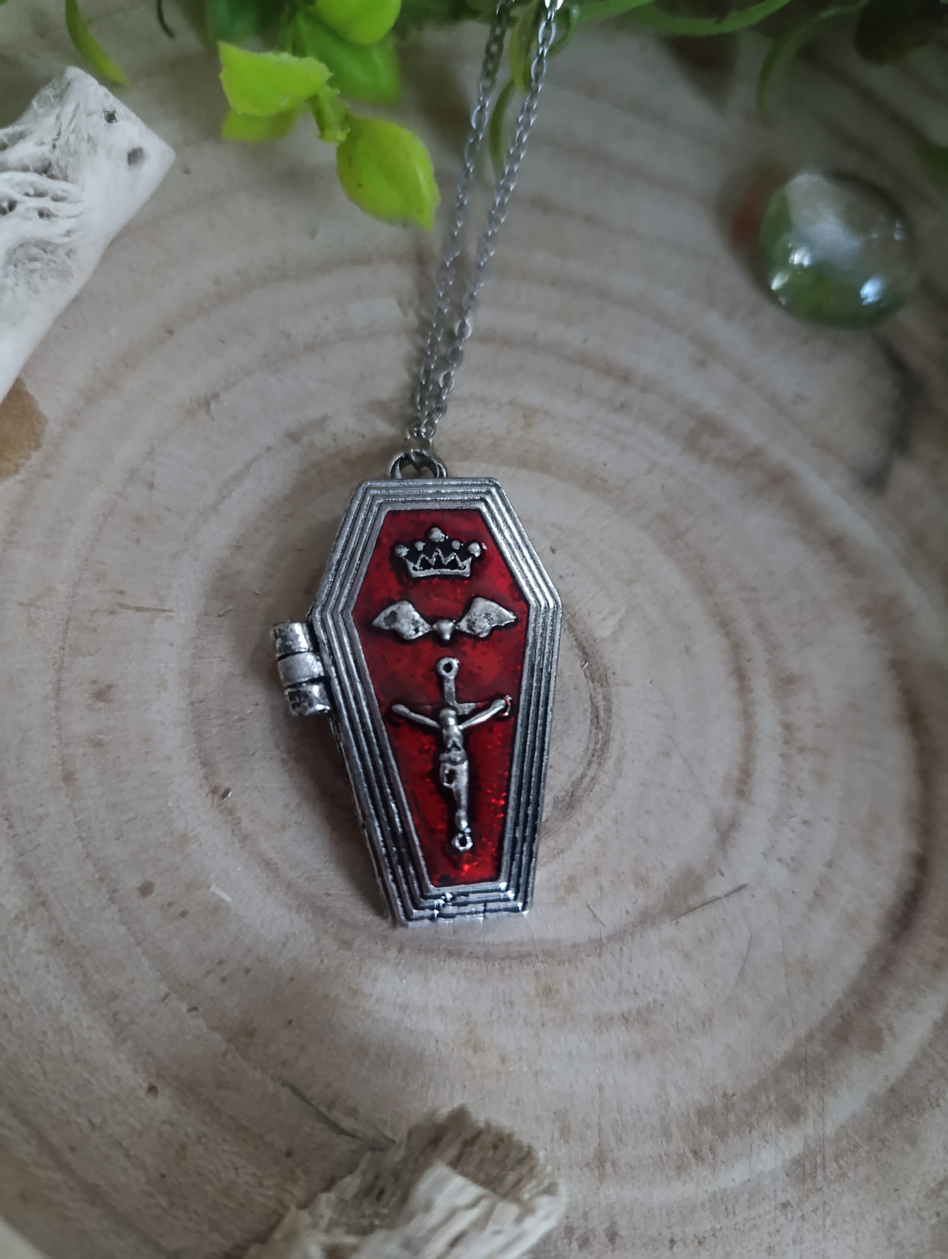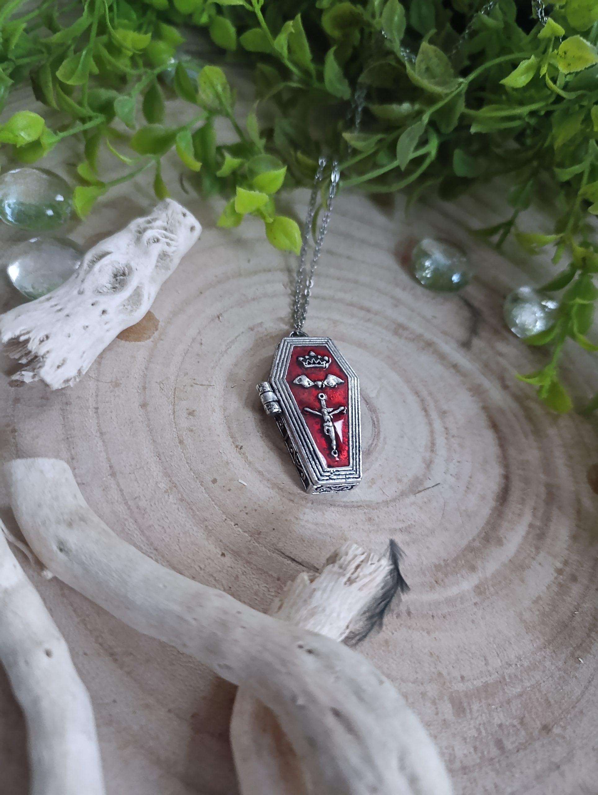 collier en acier inoxydable et cercueil de vampire avec compartiment ouvrable